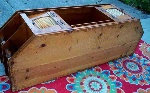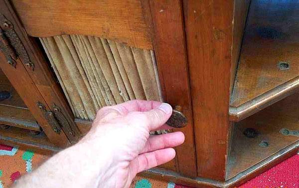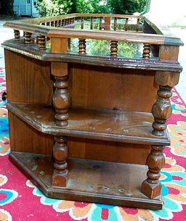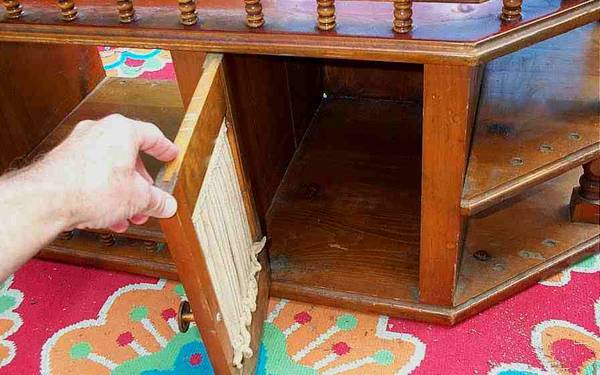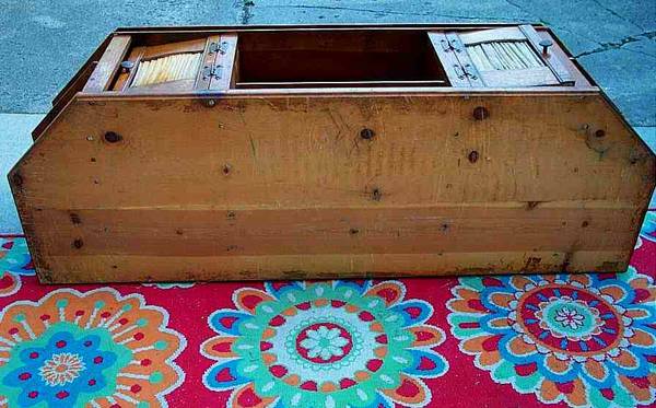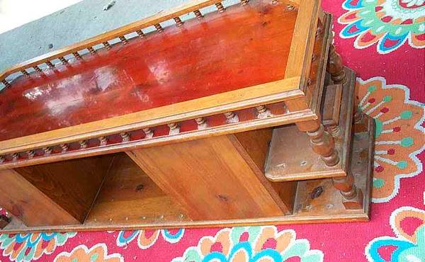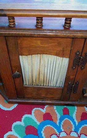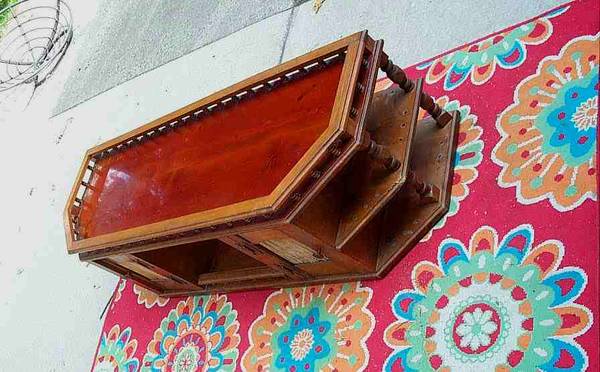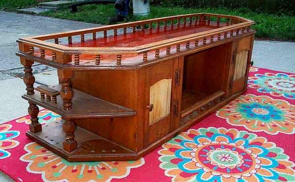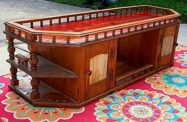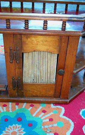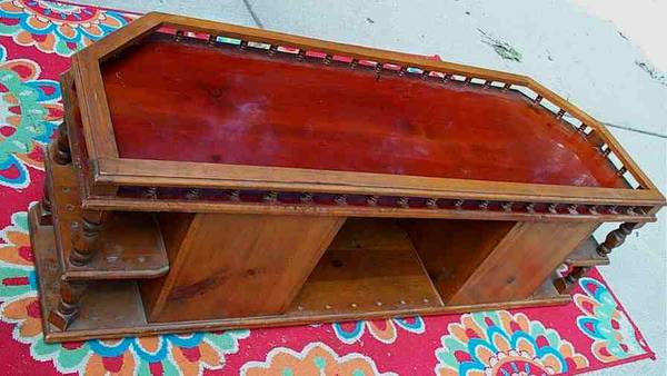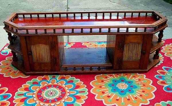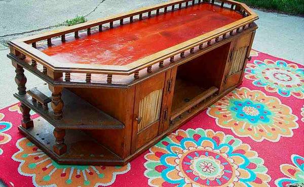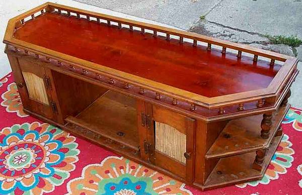 Very unusual vintage ornate rustic coffee table. Features two very decorative hinged doors with curtains to hide your storage and a guard rail top to prevent spillage. Table is made of real wood (not particle board)...and HEAVY. Top of the table is a gorgeous redish cherry type wood. Side shelves for more storage. There is some wood damage in places though overall this vintage strong table is quite striking. You may never see another quite like it. Table measures aprox 60" length x 20" deep x 18 1/4" height. Pick up from North Aurora, Illinois. Please call or text show contact info