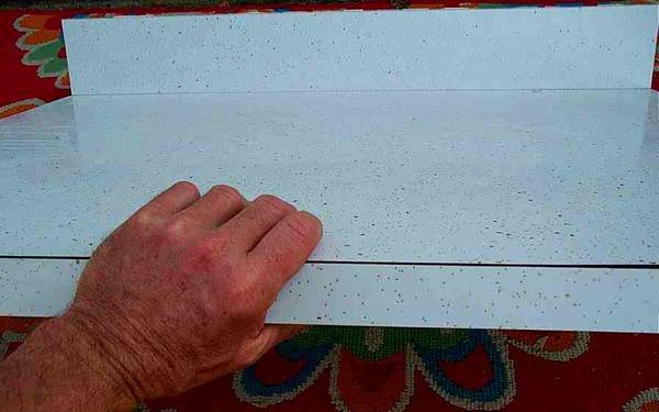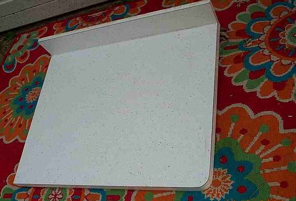 Vintage wood counter top with backsplash from a vintage 1950's 1960's kitchen or bathroom cabinet. Deco white formica top with gold speckles. Can also be used as a portable writing desk. Measures aprox 30 1/2" length x 25" deep x 5 1/2" height with the backsplash. Pick up from North Aurora, Illinois. Please call or text show contact info