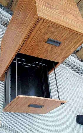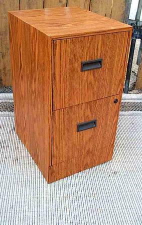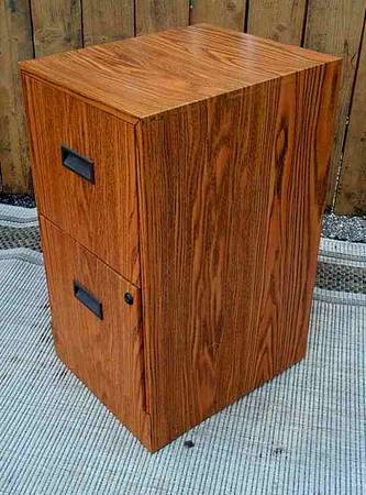 Unique two drawer file cabinet for documents. Decorative wood grain metal. Rails in place for sliding your folders. Fairly light weight makes for easy transport. Lock is in place though I do not have the key. Cabinet is unlocked. You can replace the lock or get a key made at Ace hardware if desired. Cabinet measures aprox 15" wide x 18" deep x 28 1/4" height. Pick up from North Aurora, Illinois. Please call or text show contact info