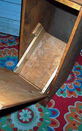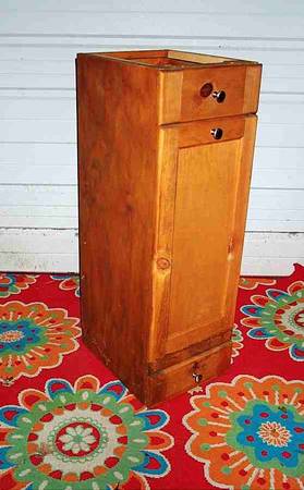 Heavy self standing kitchen or workshop slender solid wood oak color cabinet. Features an angled fold out provision for your trash can (not included). Great space saver and keeping animals out of your garbage Also top drawer storage and bottom drawer that slides out. Open top...you can slide under a cabinet or add your own top. Unique and very well made. Measures aprox 13 1/2" wide x 17 1/4" deep x 40 1/2" height. Pick up from North Aurora, IL. Please call or text show contact info