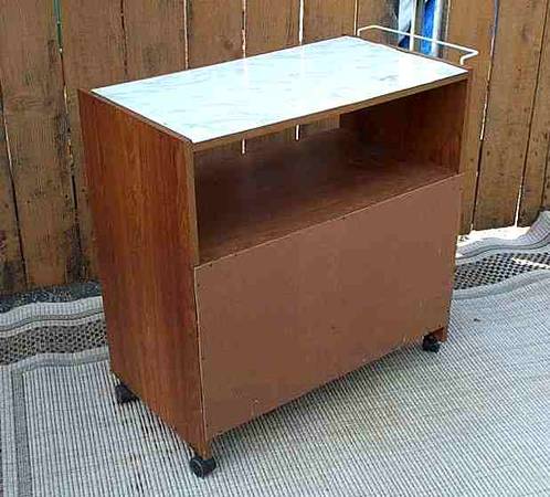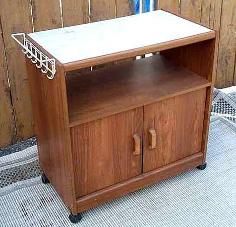 Microwave cart on wheels. Wood grain panels. Side hangers for towels and utensils. Also good as a TV stand. Middle shelf for devices such as gaming consoles. Two bottom hinged doors that open up for even more storage. Measures 28 1/4" length x 15 3/4" deep x 29" height. Pick up from North Aurora, Illinois. Cash only. Please call or text show contact info