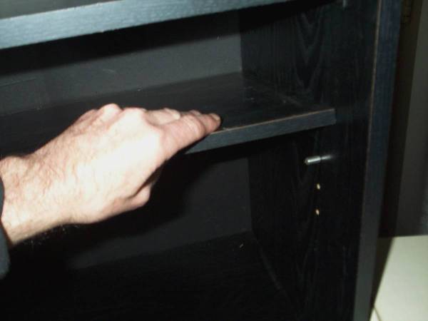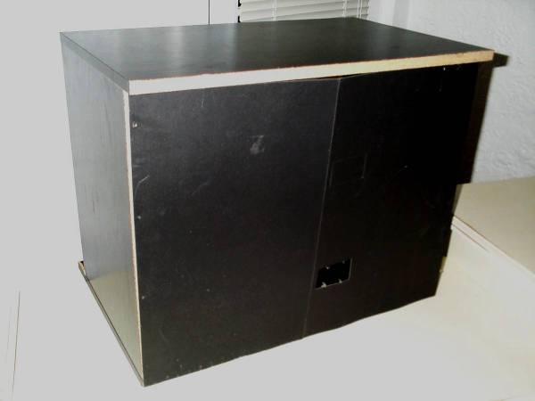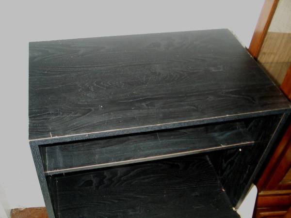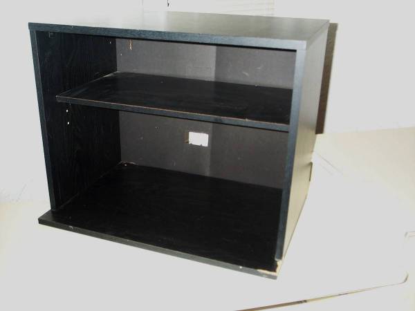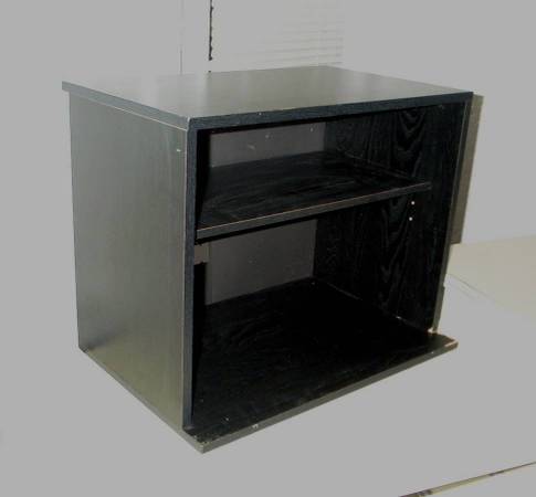 Compact size black TV stand with an adjustable shelf. Also good for stereo receiver, video equipment, gaming console storage, etc. Hole in back to feed wires through. Measures aprox 23 1/2" length x 16" deep x 19" height. Some wear though still strong. Pick up from North Aurora. Please text show contact info