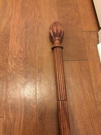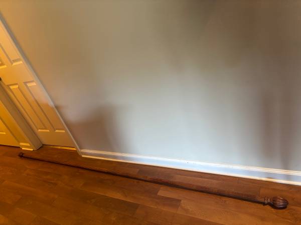 Long Curtain Rod. Wood, brown color. Overall 112” long, net long 103” (with 7” extension). Rod diameter 1.5”. Please reply with your name and phone number. Thanks.