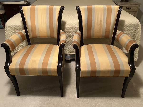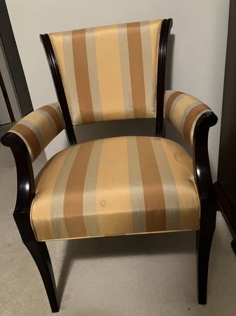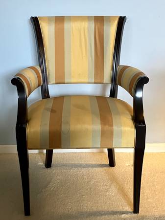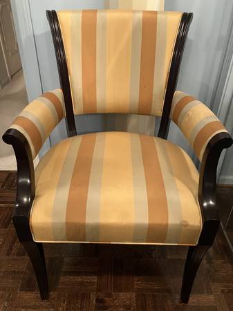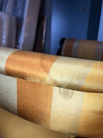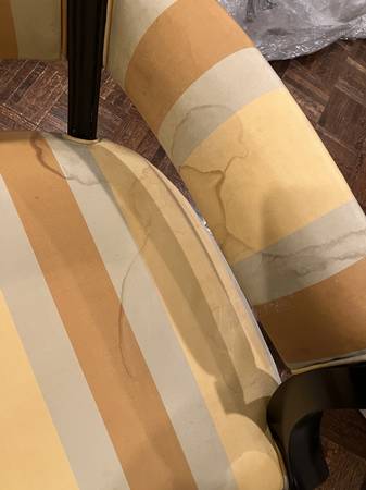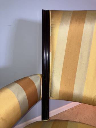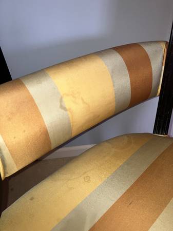 • Classic striped silk-blend upholstery in gold, burnt orange, and griege tones (VERY STAINED)