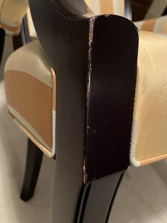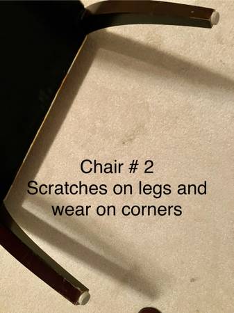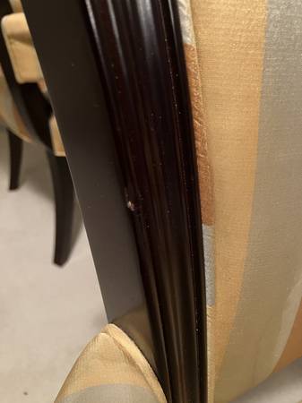 The mahogany frames, especially on the legs, have several chips, scratches, and mars -- see photos. The upper frames have very few imperfections.