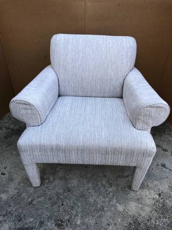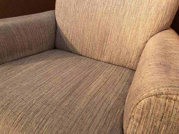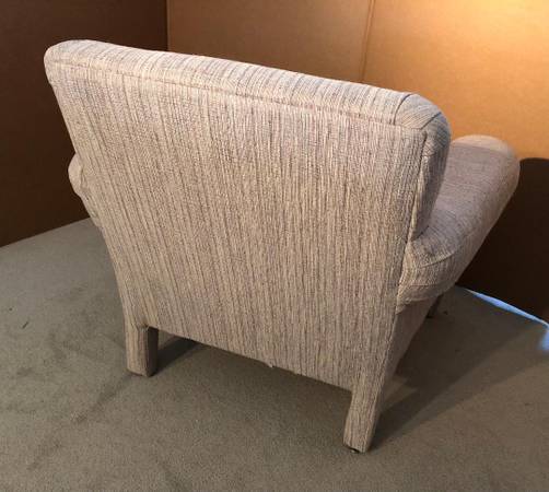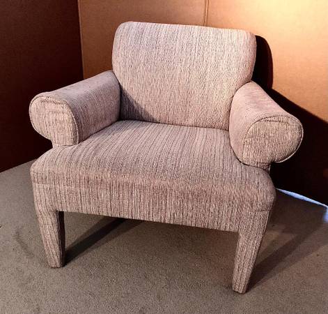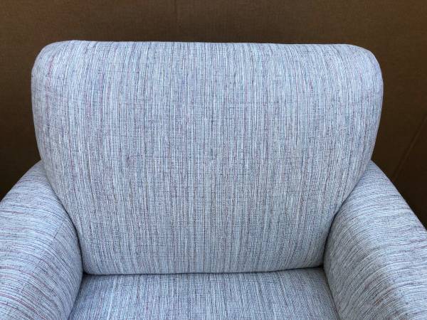 Upholstered Arm Chair. Back Height 29". Seat Height 17.5". Depth 29". Outside Arm Width 35". Inside Arm Width 20". Arm Height 22". 2 photos taken outside. Comfortable. Lighting affects the fabric...