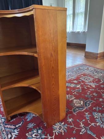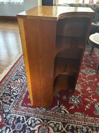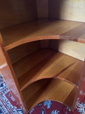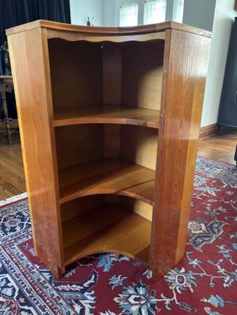 I have a Mid-Century Modern large teak corner cabinet/bookshelf for sale. Corner shelves are ideal for utilizing often-underused corner spaces for storage and display, perfect for books, decorative items, or even plants.