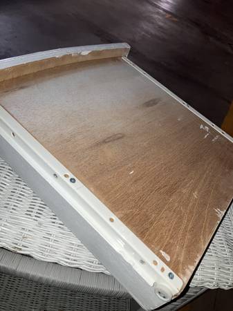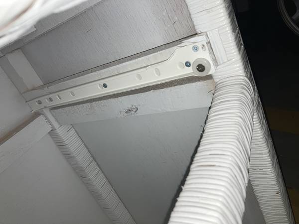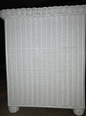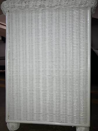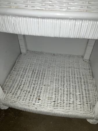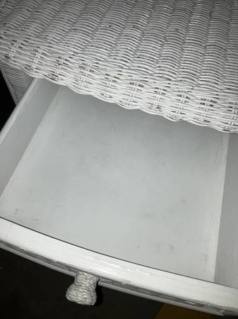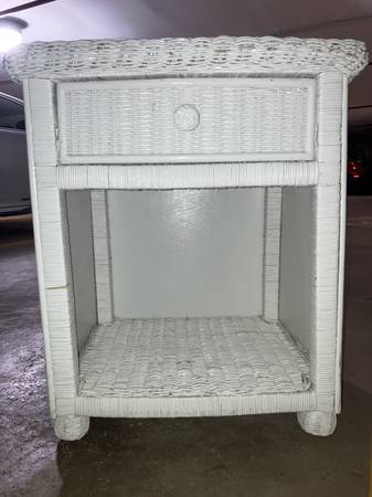 Vintage sturdy white wicker nightstand with a drawer and shelf. Ready for poch pick up. Very good condition. One of the pieces of wood above the drawer track on inner frame has a slight crack -- see...