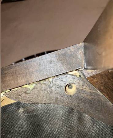 Vintage wooden chair with cushioned seat -- needs slight repair. Upholstered cushion has pen mark and needs clean-up. Legs are scratched -- see photos for condition. Ready for porch pickup.