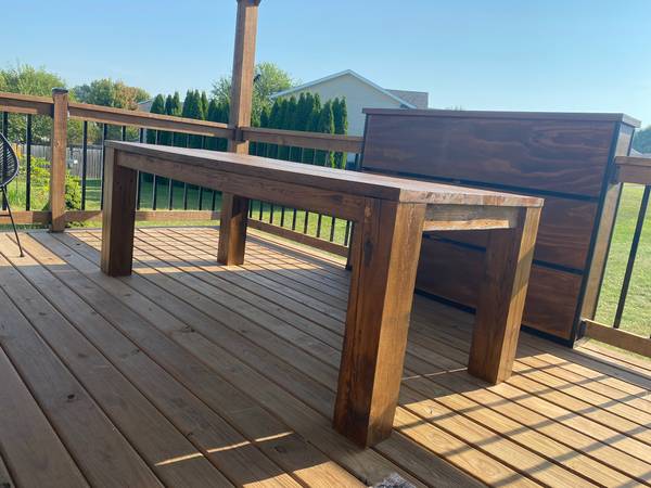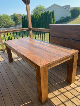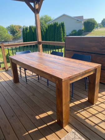 Selling this outdoor Telluride farmhouse table made from reclaimed treated pinewood. The stain is Minwax Early American #230 and top coated with Spar Urethane for weather protection. Measurements are 84" L x 37" W x 31" T.