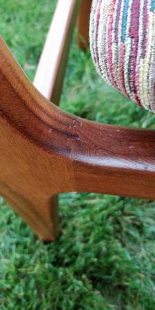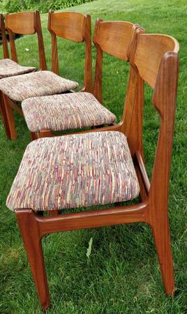 Set of five gorgeous mid century Danish solid Teak wood floating style chairs by Findahls Møbelfabrik. The wood is in fantastic condition as shown. They are incredibly well constructed with clean finger joint and dowel construction; no screws, nails or ugly hardware exposed. May need a little bit of work: one chair is missing padding and another has been reupholstered in a different fabric.