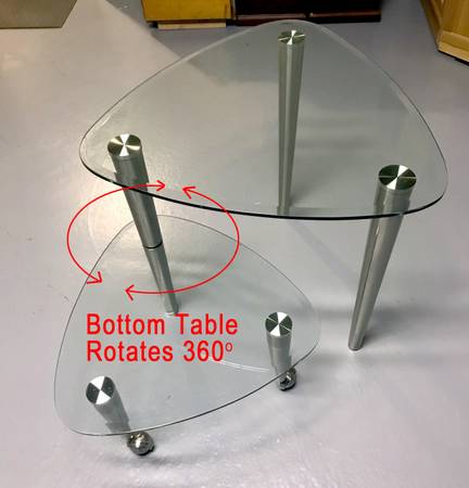 This table brings a distinctive contemporary look and urban feel, featuring thick 10mm beveled tempered glass along with stainless steel legs. This modern looking table makes a bold eye-catching statement. “Lower table rotate a full 360 degrees”!