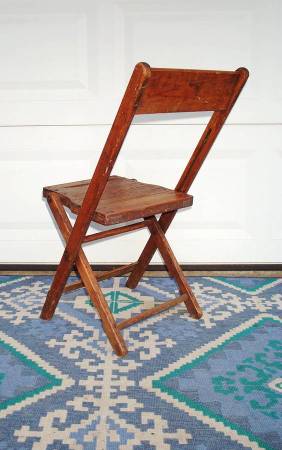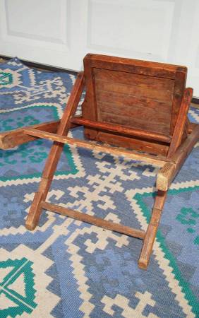 Antique folding portable chair. Circa 1930's 1940's vintage. Primitive and well made. The wood is absolutly beautiful. Measures aprox 16" length x 16" deep x 32 1/2" height. From floor to seating area aprox 16" height. Pick up from Villa Park. Please call or text show contact info