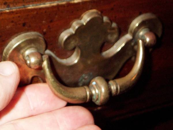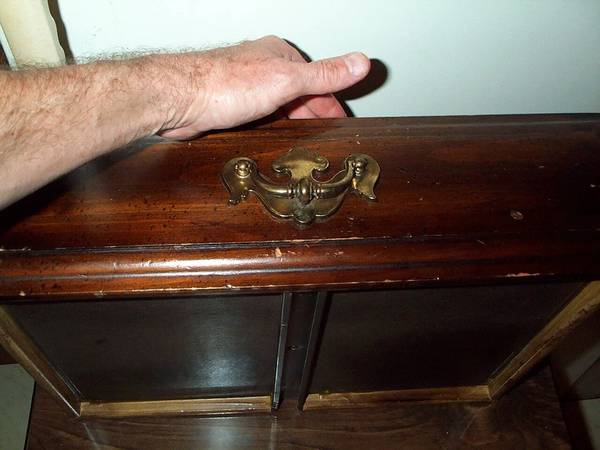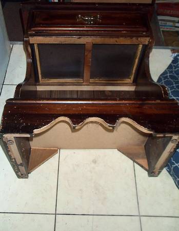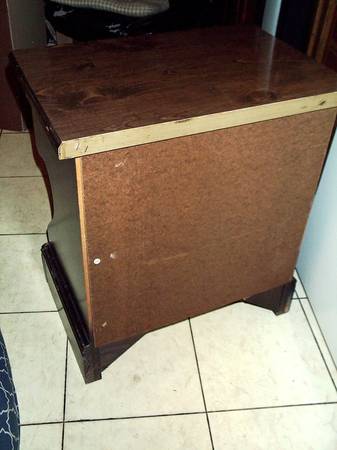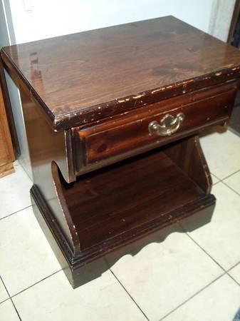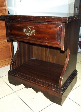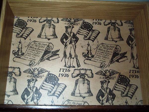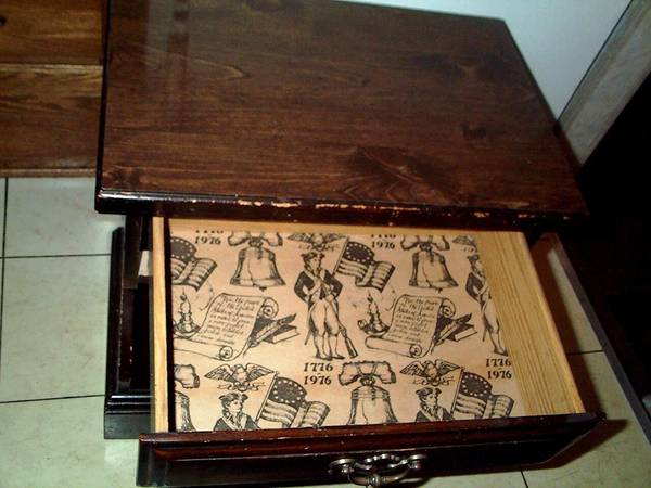 Ultra rare Early American style night stand end table with a single pull out drawer with embossed USA bicentennial themes printed on the bottom wood of the drawer. Liberty bell, eagle, Declaration Of Independence, etc. Original gold color pull handle on the drawer. Scuffs and wear on the front. Table is very strong and fairly heavy for its size. Exactly as pictured. Table was probably manufactured circa 1974 1975 time period. If you collect rare 1970's furniture, this may be for you. You may never see another quite like this. With a little touch up and clean up this table will be gorgeous. Measures aprox 22 1/2" wide x 15" deep x 25 14/16" height. Pick up from Villa Park, IL. Please call or text show contact info