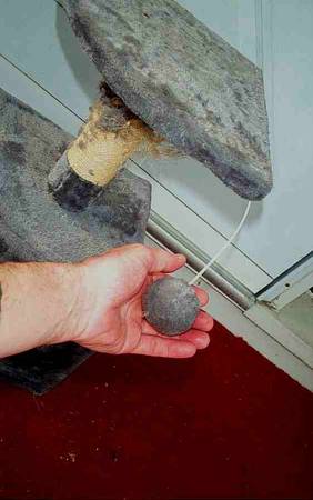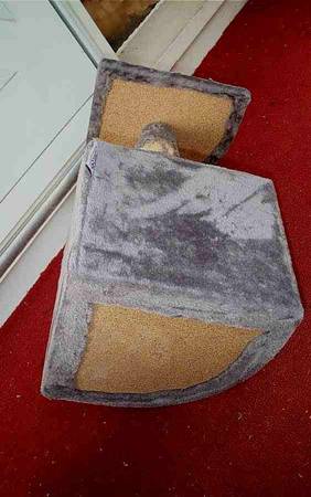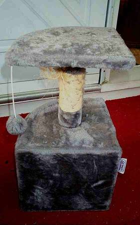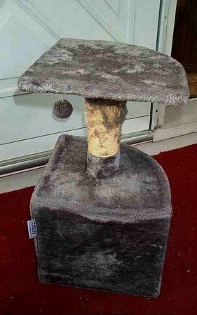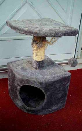 Compact size cat tree scraching post. Features a bottom cave style bed, scratching post, hanging play ball and top pearch. Gray color rug for softness. Your cat will love it. Manufactured by "Heart To Tail". Measures aprox 16" length x 13" deep x 20 1/4" height. Pick up from Villa Park. Please call or text show contact info