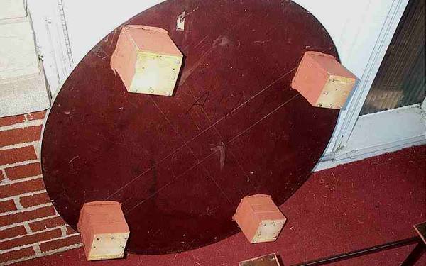 Vintage round coffee table. Strong metal leg base. White formica no stain top. Custom made blocks of wood attached to raise the table height. Top removes for ease of transport. Table measures aprox 35 1/2" round x 19 1/2" height. Pick up from Villa Park, Illinois. Please call or text show contact info