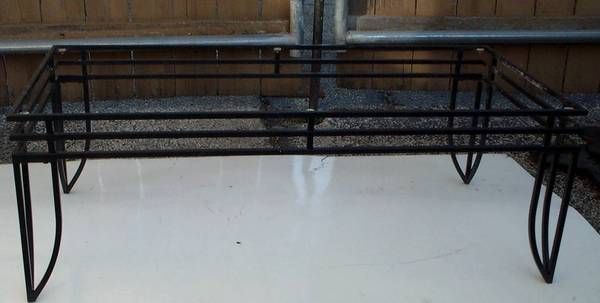 Strong black metal cocktail table. The glass top is missing. Other than that nice condition. Glass can be cut at Ace Hardware. Table measures aprox 45 1/2" wide x 22" deep x 16" height. Pick up from Villa Park, IL. Please call or text show contact info