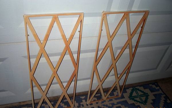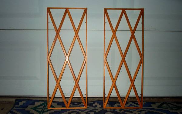 Two unusual matching vintage decorative criss-cross cover inserts. Good for many applications. Everything from the front of a speaker to a wall opening. Mini philip screws on side to tighten and secure to your application. Each measures aprox 12" length x 1/4" thick x 30 1/2" height. Pick up from Villa Park. Please call or text show contact info