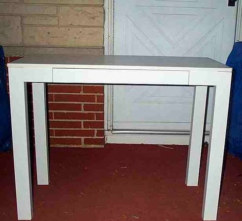 Compact size light weight white wood desk. One center drawer that slides out for paper, pencils, etc. Desk is unbranded though it looks Ikea style. A few marks on top though otherwise nice. Items pictured in the drawer are not included. Desk measures aprox 39" length x 20" deep x 30" height. Legs removed for ease of transport. Pick up from Villa Park, Illinois. Please call or text show contact info
