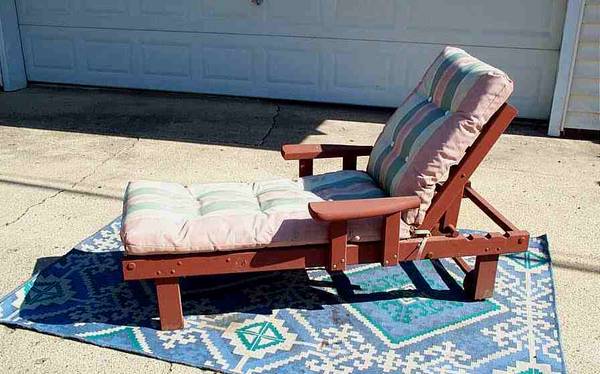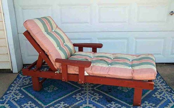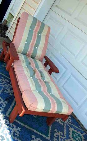 Surviving vintage outdoor lounge chair. Great for patio, deck and yard. Redwood style furniture. Includes original long cushion. Folding backrest is adjustable for optimal positioning. Circa 1970's 1980's vintage Suspension metal spring loaded strips are in perfect condition. Great condition for its age. If you desire a period correct patio lounge chair...this may be for you. Very comfortable! Chair measures aprox 31" wide x 62 1/4" deep x 38" height with backrest up and 17" height with backrest down. Pick up from Villa Park, Illinois. Please call or text show contact info