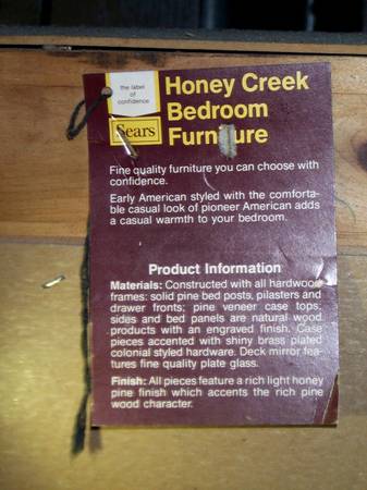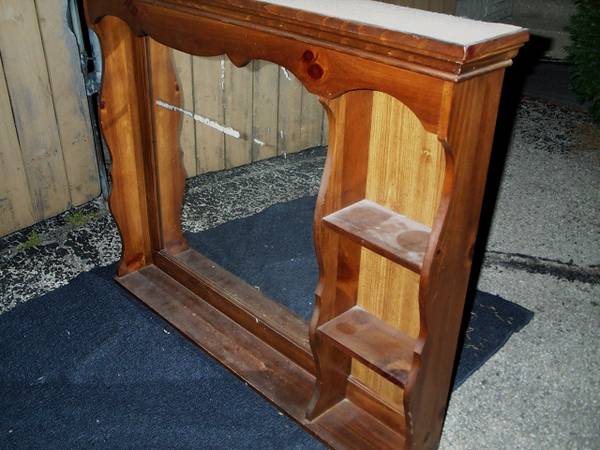 Beautiful wood vintage Sears Honey Creek top shelf cabinet mirror to be placed on top of a bedroom dresser hutch...or self stand the way it is. The mirror has some tape residue that will come off with a little rubbing. Sears number 2325.64963 1221. This item measures aprox 50 1/4" length x 7 1/4" deep x 40 1/2" height. Pick up from Villa Park. Please call or text show contact info