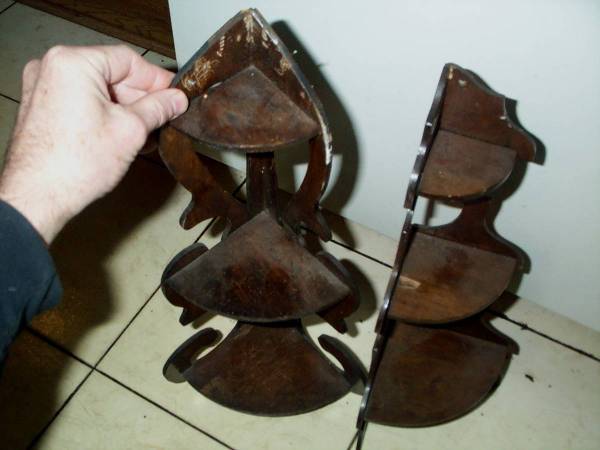 Price gets both vintage shelves. Two antique compact size similar wall hanging wood corner shelves. Light weight. Circa 1940's vintage. Great for knick knack displays. One shelf measures aprox 8 1/2" wide x 5" deep x 19" height. The other shelf measures aprox 8" wide x 4 1/2" deep x 17" height. Pick up from Villa Park, IL. Please call or text show contact info