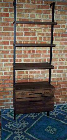 Tall four level shelf organizer with two drawer bottom storage. Nice wood grain with strong heavy metal frame. Self standing...lean against the wall. You can mount the top two brackets to the wall for extra security. Shelf measures aprox 23 3/4" wide x 14" deep x 54" height. Pick up from Villa Park, Illinois. Please call or text show contact info