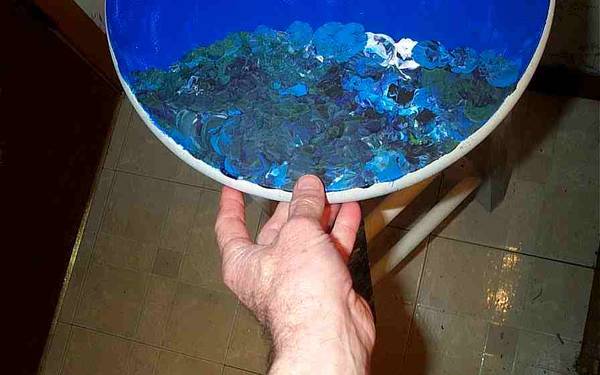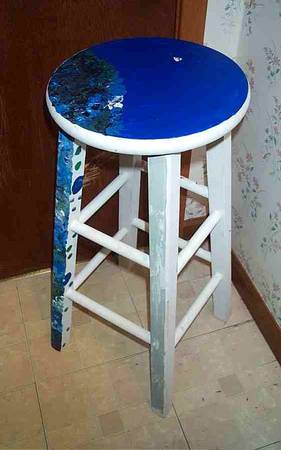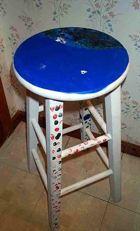Unique strong vintage wood stool. Hand painted with a unique type colorful water theme. Adds to a happy decor for a work shop, tall desk or table. Measures aprox 13 1/2" round 29" height. Pick up from Villa Park. Please call or text show contact info