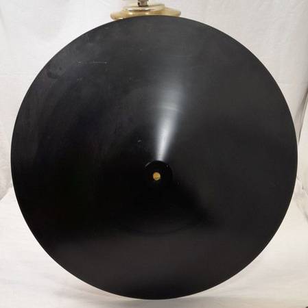 I have for sale a brass table lamp. The shade measures approximately 21 inches in diameter and the lamp measures approximately 24 inches high. The black metal shade has a few scuffs, and the brass has some brown spots. The switch on the cord has Off-Low-High settings.