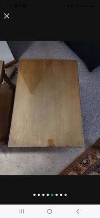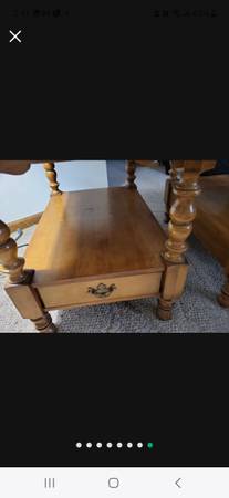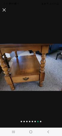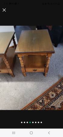 Solid maple Wood end tables. Very heavy. Quarter inch glass top on each. In good shape. Both have a bottom drawer Local pickup only 28" deep 20" wide 23" tall