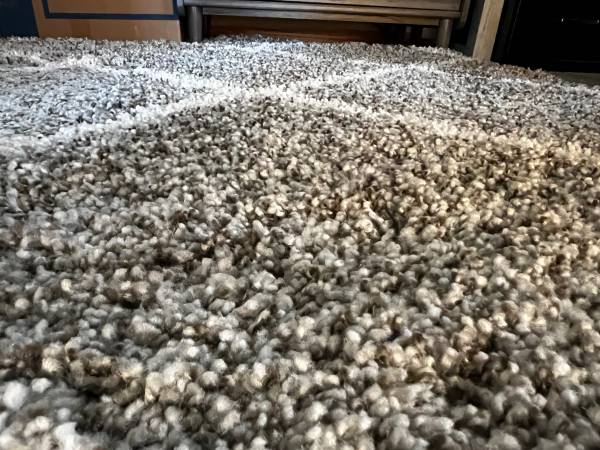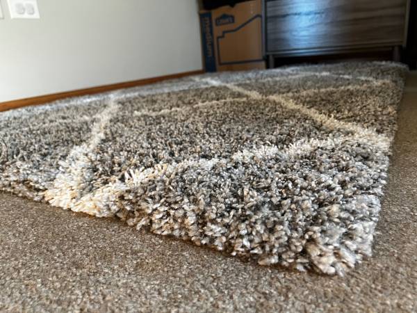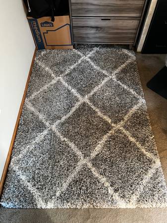 Really good condition and clean area rug. Dimensions are approximately 6ft by 4ft. Gray and white color/design. No stains and no smoking and no pet home. Pickup in Woodridge