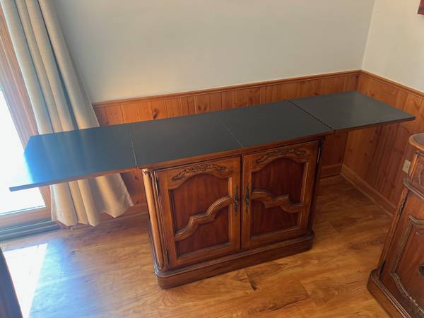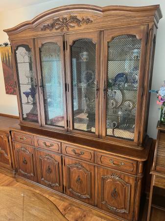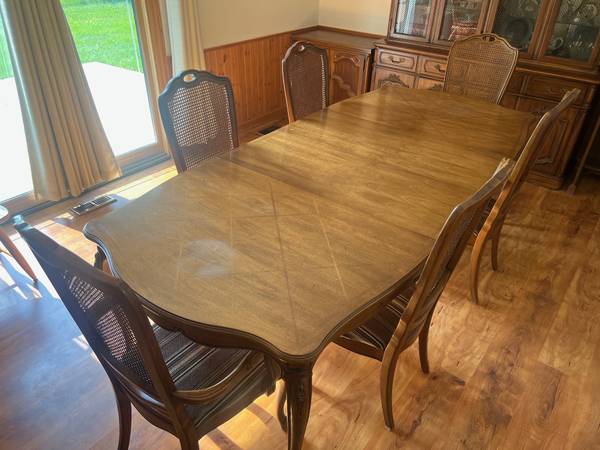 Beautiful Thomasville dining set from 1966, built from solid wood with timeless mid-century style. Perfect for a vintage or classic home. 1966 16-piece Vintage Thomasville Furniture Set Includes: -...