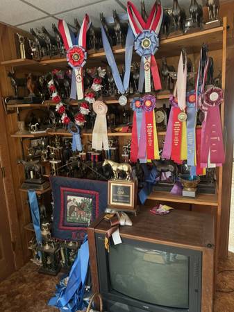 100s of Horse Show Trophies/Memorabilia/Ribbons, Etc., 231 Square Bales of Alfalfa/Grass, Tack Room - Full, Drag Cart, Water Tanks, Bunk Feeder, Upright Air Compressor, Lg Fan, Power Washer, Rubber Wash Tanks, Saddles, Bits, Horse Tack, Horse Show Belt Buckles, Huskey Upright, Livestock Gates, Yard Machine Rototiller, Fiestaware, Furniture, Home Collectibles, Horse Card - Red w/ White Pinstripe - Large Wood Wheels, Weathervanes, 8HP Walk Behind Bush Hog, 4’ Jockey Light, Ladders, Lg iron Kettle, Well Pump, Cement Pig, Benches & Stools, Mink Stoles, Vintage Clothing, Iron Cistern Pump, TV Tower, Miller Tin Beer Sign, (2) Rubbermaid Dump Carts, Metal Silhouette Signs, Pedestal Floor Fan. LP Fry Cooker, Stack Chains, Groom Cart, Work Cart, Shop Vac, Hand Tools, Rubbermaid Dump Cart, Fiberglass Werner Ladder, Ext. Cords, Backpack Sprayer, Small Anvil, Battery Drills, Single Trees, Cast Iron School Bell w/ Yoke, Old Bird Houses, Oat Crimper, Childs Park Bench, 16 Louver Units, (9) Iron Lawn Furniture Chairs, Gas Power Washer, Adv. Box, Black Max 2800 PSI Gas Power Washer, Pull Type Finco Sprayer, Lg Vise, Box Fans, Copper Horse Weathervane, Metal Horse Weathervane, Campbell Air Compressor, Pull Type Lawn Sweeper, Log Chains, Wood Show Chairs, Rios of Mercedes Lady Cowboy Boots, Indian Bist Lamp, Large Cast Iron Kettle, Roll Chain-link Fence, Wester Cooker, Rubbermaid Poly Tank, Cast Iron Wall Sign, Upright Air Compressor - Not Running, Live Trap, Lg Coolers, Target Game, Battery Charger, Bridle & Horse Tack, Christmas Trees, Stihl Weed Eater, Power & Hand Tools, Ready Heater, Stop Ahead Sign, Westernware Shirts Etc., 2 Sets of Horse Walker Arms, 2 Sets of Buggy Shaves, Fiberglass Pannel Roofing, Barn Wood, Iron Star Light, Signs, Pards Advantage Boots, Logan Boots, Freight Scale, IL Star Fair Trophies.