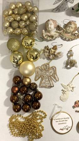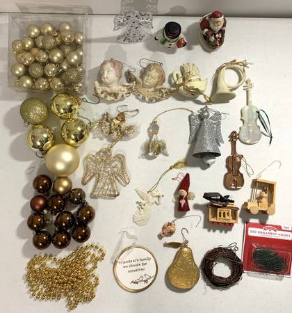 90pc Christmas Tree Ornament - beaded garland & 3 figurine Bundle - **$10 takes ALL or some** *Includes: - 68 round gold & bronze ornaments (various sizes - mostly small) - 1 Strand of...