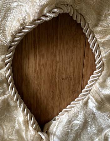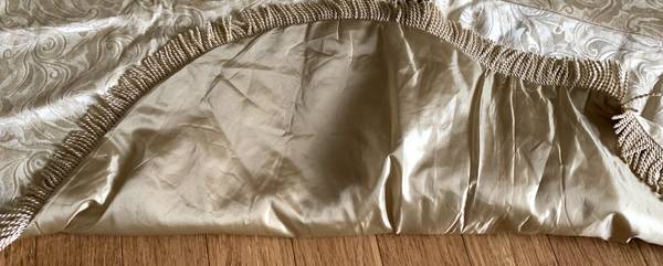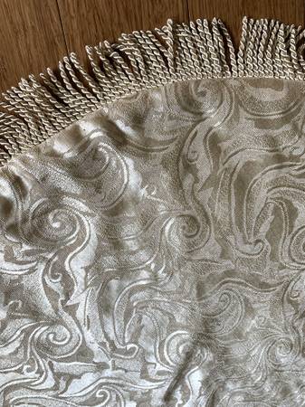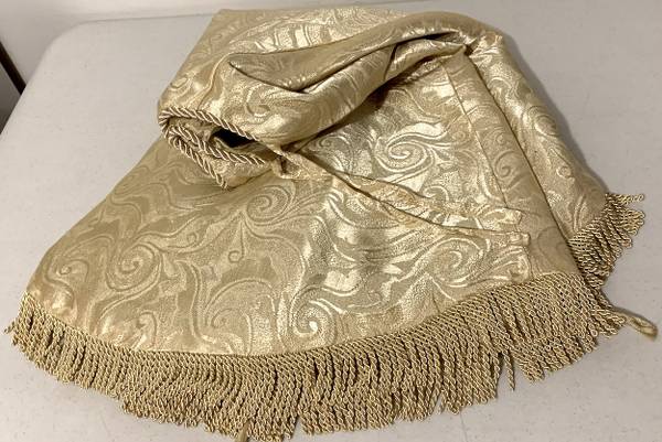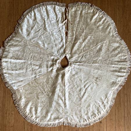- Christmas Tree Skirt - 54" gold pattern satin fabric with fringe - *Excellent (like-new) pre-owned condition from a smoke free home