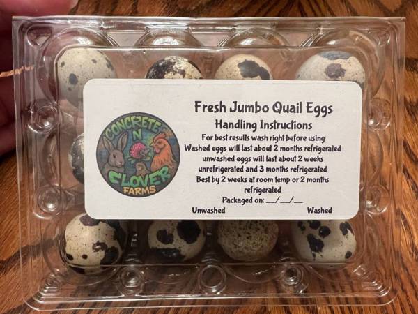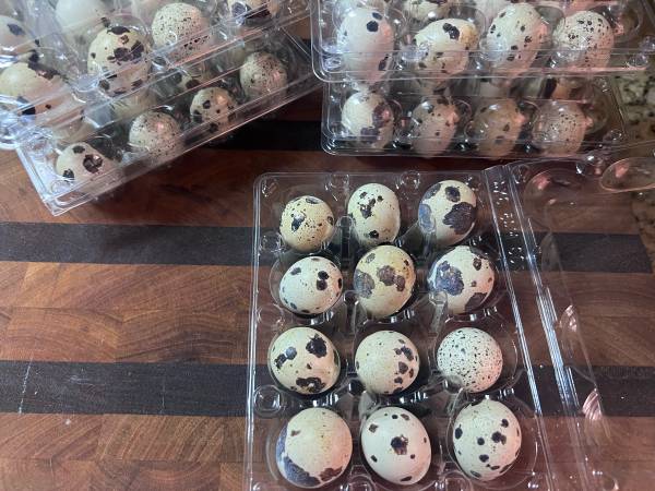 Jumbo cotournix quail eating eggs directly from a local urban farm. $5/doz