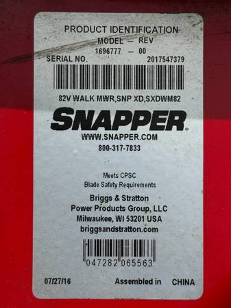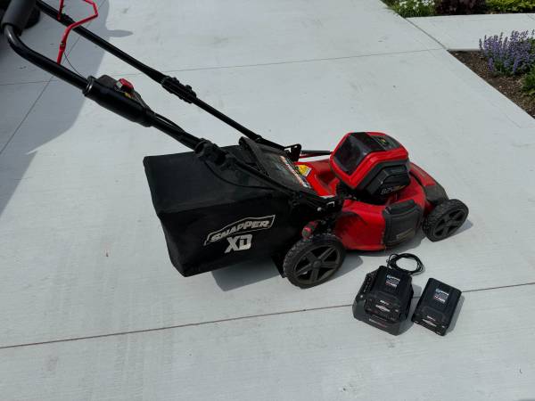 Snapper XD 82V Battery Operated Lawn Mower - excellent condition - includes rear discharge bag, charger and 2 batteries
