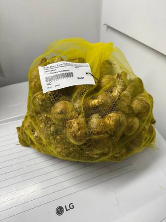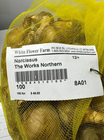 White Flower Farm bulbs. I bought 300 but only needed 170. "We call our premium Daffodil mix The Works because that's what it is. It's a mixture of 30 top-quality varieties blended to provide the widest possible range of color, form, and bloom time. Among the assortment are colorful Trumpets, hardy Large-cups, ruffled Split-cups, as well as dainty and fragrant Tazettas and Cyclamineus varieties." $65 now on their website; buy my bag for $20.