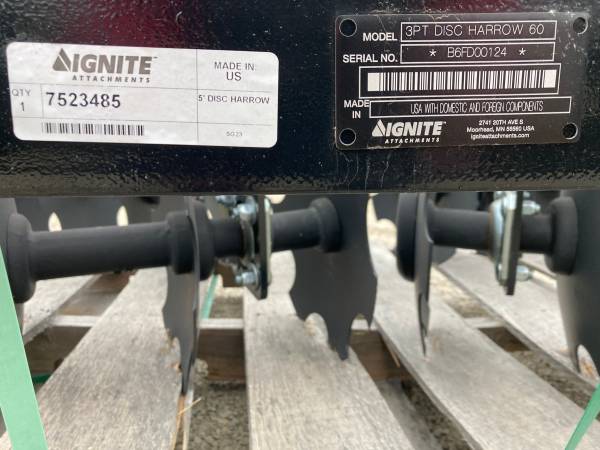 NEW, STILL ON SHIPPING PALLET. IGNITE ATTACHMENTS, 60" DISC HARROW. CAT 1. PURCHASE IN 2025. ( RETAILS FOR OVER $1,800. ) SELLING FOR $1,000 CAN LOAD ON YOUR TRUCK OR TRAILER, WITH A SKID STEER, OR POSSIBLE DELIVERY, FOR A FEE. SERIOUS INQUIRIES, CALL show contact info