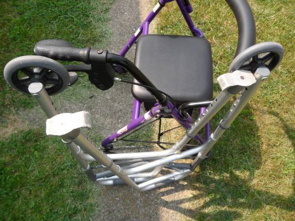 , it has two wheels in the front and slide pads in the back. It is in very good sturdy condition.Please send your number along with any questions you may have and I'll get back to you as soon as I can.