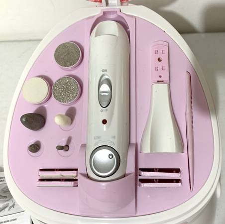 - 12 attachments (Cuticle Shaper, Metal Smoothing Plate, Metal Shaping Plate, Buffing Plate, Smoothing Plate, Small, Medium AND Large Stone/Sapphire Cones, Smoothing - Shaping & Buffing Discs