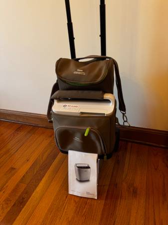 Barely used Phillips Respironics Simply Go portable oxygen. Private party sale. Works with batteries (4 extra), plugged into household outlet or plugged into vehicle accessory port. Extremely quiet running. Also has optional wheeling cart, shoulder strap and case, extra charging cord and extra car cord. Delivers continuous flow up to 2 liters and pulse flow up to 6 liters. Willing to drive to meet in a public central location for a serious buyer. Asking $1250. This is way less than half the original cost, used only as a back up, likely about 15 hours running time.