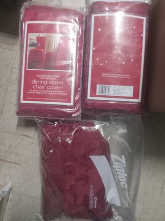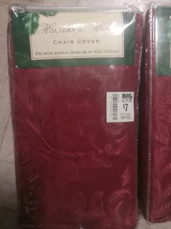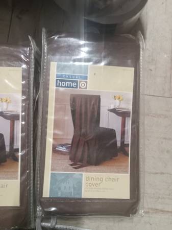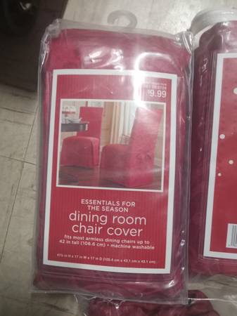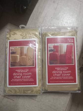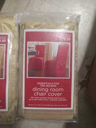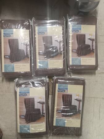 For sale are multiple never used dining room covers that will no longer be needed due to change in chair types. Included are five brown Casual Home covers. Four have never been taken out if the package and the other was to see how it would look on our chairs but the package remains. The five sold new in between $80.00 and $85.00 and we are selling them for $50.00. Next are five burgundy/maroon color ones with four still in their packaging and one opened in a bag. Two are from Essentials if the season, two are from Holiday at Home and fifth one in bag is one of the two already mentioned. The five originally sold around $50.00 and we are selling the set for $30.00. Finally we have two gold color Essential for the Season covers that we are selling for $15.00. If interested please let us know which chair covers you are interested in. Thank you for looking.