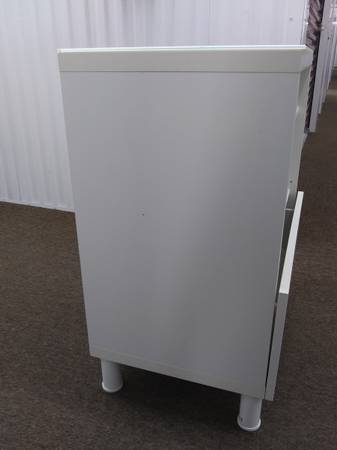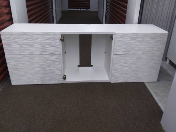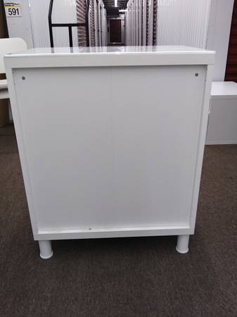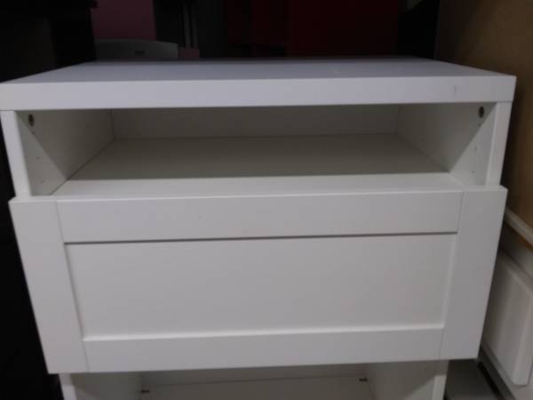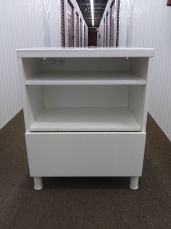 For sale is a white Ikea Besta nightstand setup. It is in good to very good condition. It consists of a frame, a drawer, drawer slides, a drawer front, 2 shelves, a glass top, and either legs or casters. The unit is about 16" deep by 24" wide by 28" high. New it would sell for about $145.00 (35.00, 15.00, 10.00, 20.00, 20.00, 20.00, 10.00) with tax, and we are selling it for $80.00. We are also selling a few white Ikea wall cabinets (with or without a drawer) and a few white Ikea Tv stands in other listings (last few pictures). Complete your best(a) storage area!!!