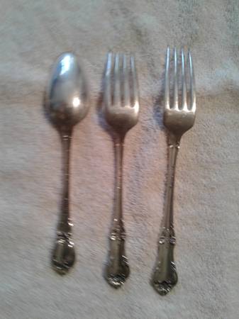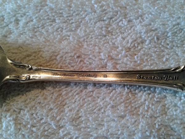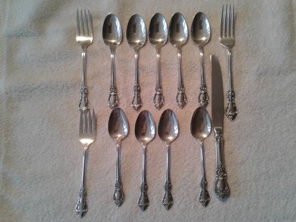 Oneida heirloom sterling silver flatware 13 pieces Stanton hall / after glow pattern not monogramed. Set includes 1 dinner fork 46 grams. 2 salad forks 74 grams, 4 afterglow tea spoons 128 grams, 5 Stantonhall teaspoons 185 grams plus 1 butter knife silver handle stainless blade. 433 grams sterling 400 grams pure.12.9 troy ounces melt value today $479 plus knife.Will seperate ask for price. See pics for condition $499 OBO Must meet at police station near me ! Cash only no trades ! Thanks for looking.