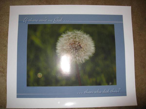 Stunningly beautiful actual glossy photographs, poster size (21"x26"), of nature scenes, with the script writing: "If there ain't no God...then who did this?" on each one. Great for Church bulletin boards or wall deco!