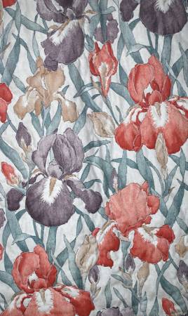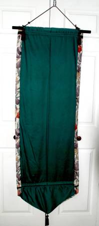 Hand-made, measures 20"W x 5ft High. Dowel attached for scroll-like hanging / appearance at top.