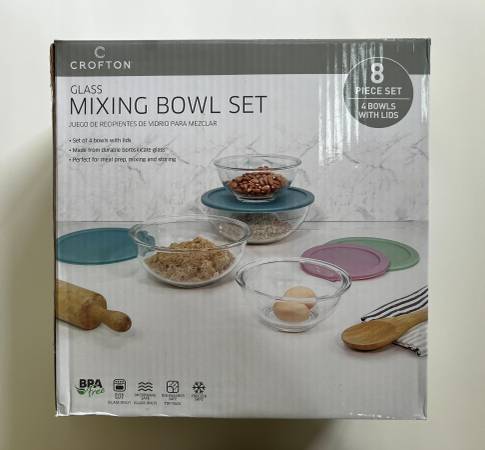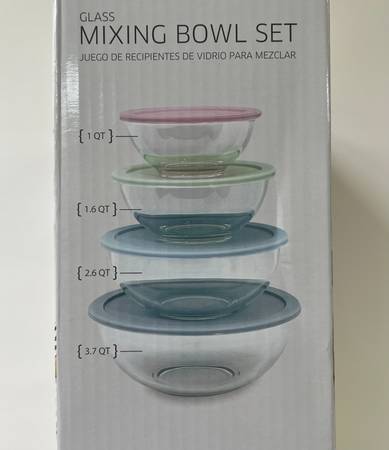 Two new in box 8-piece glass mixing bowl sets. Made from durable borosilicate glass. Elegant and soft colors’ lids. Perfect for meal preparation, mixing and storing. 4 Different stackable sizes for compact storage. BPA free. Oven, Microwave, Dishwasher, and freezer safe.