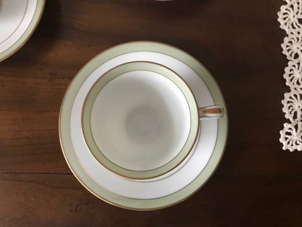 I have a Greenbay by Noritake demitasse/espresso set for sale. The pattern is called Greenbay and has a green band with green/gold leaves in the center. The pattern has been discontinued and was made between 1953 – 1960 in Japan.