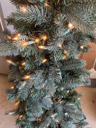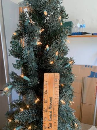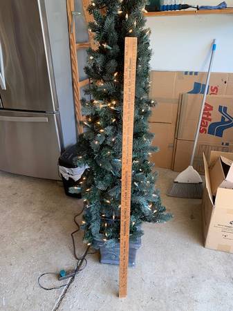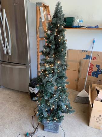 Cute front porch Christmas decor - matching pre-lit potted slim trees. 60" tall with cement bases. Pickup in West Chicago near Rt. 59 & Rt. 64 (North Ave.)